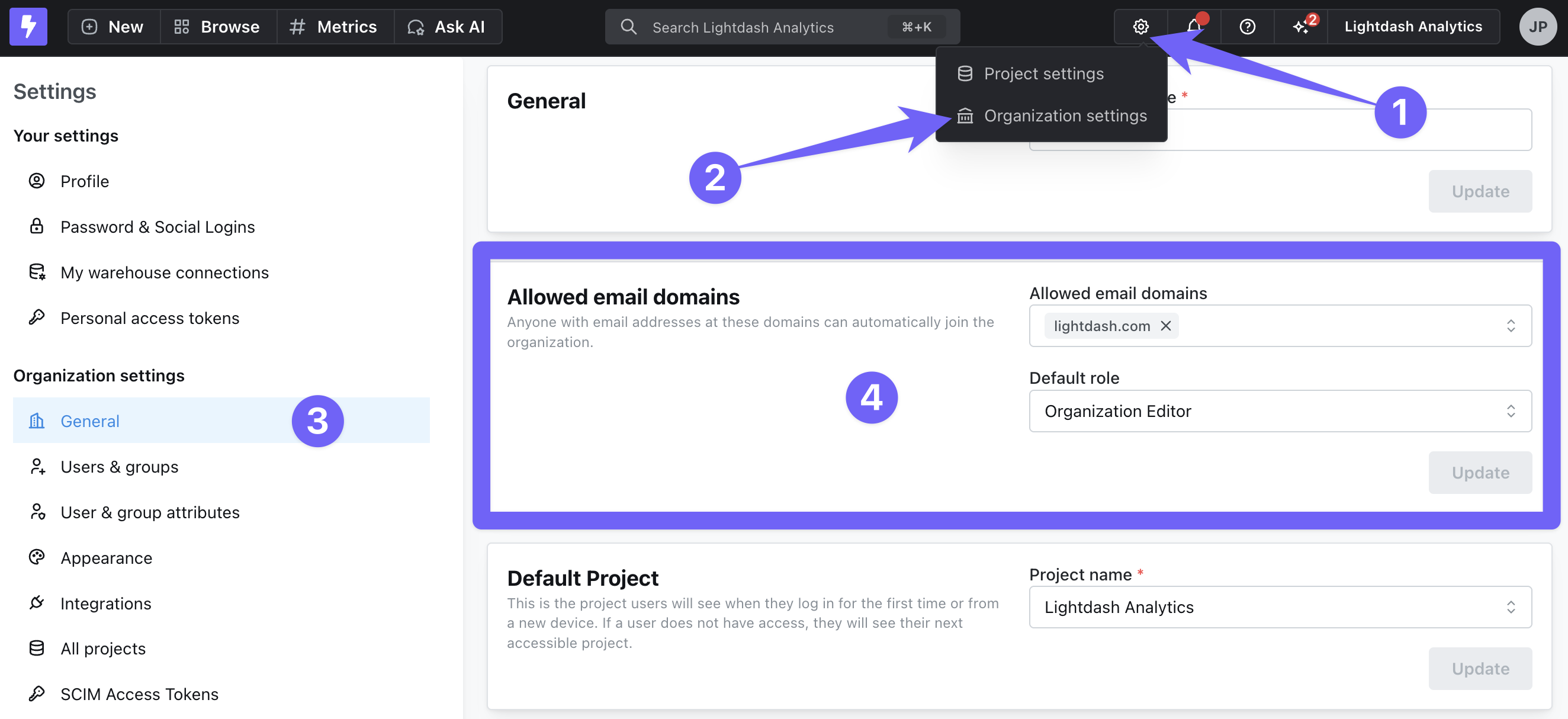 In the Allowed email domains panel, enter the email domain(s) you want to be able to automatically join your organization (e.g. here, we’ve added lightdash.com). Generic email domains like gmail.com or hotmail.com are not accepted. You can then select the access that you want these users to have by default. The organization Admin can always update a user’s permissions after they’ve joined!